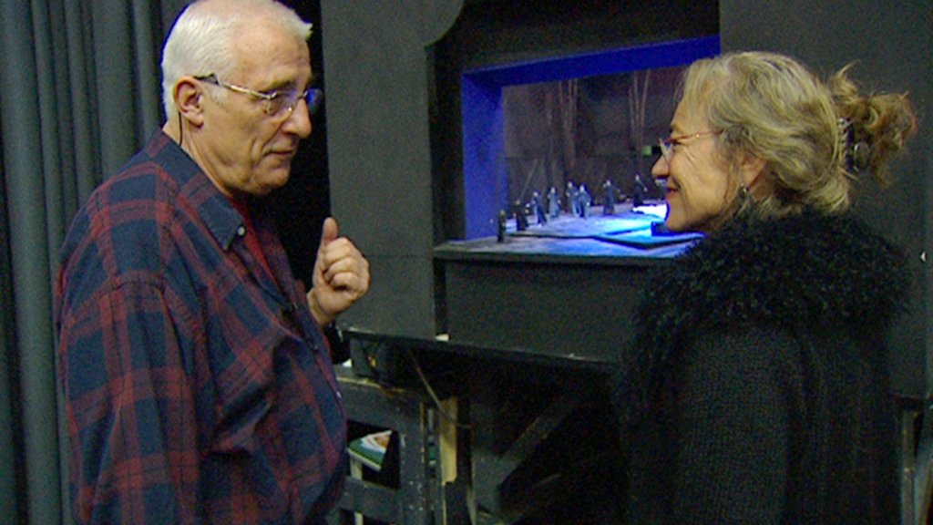 Vera Botterbusch mit Jürgen Rose bei Dreharbeiten zu “Norma” in den Werkstätten der Bayerischen Staatsoper